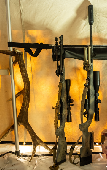 Easily attaches between the frame joints on the inside of your wall tent and keeps guns upright and out of the way. Simple design allows for the barrel of a rifle to easily slip up through the pre cut slots and keeps them secure and next to the side wall of the tent.
